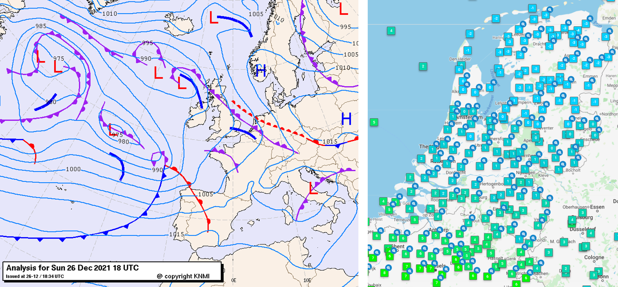 Figuur 4: Links: De weerkaart op tweede kerstdag in de avond. Het warmtefront ligt boven het midden. Rechts: De waarnemingen op tweede kerstdag om 19:00 LT (18:00 UTC). Ten noorden van Arnhem-De Bilt-Amsterdam zit nog steeds de kou.