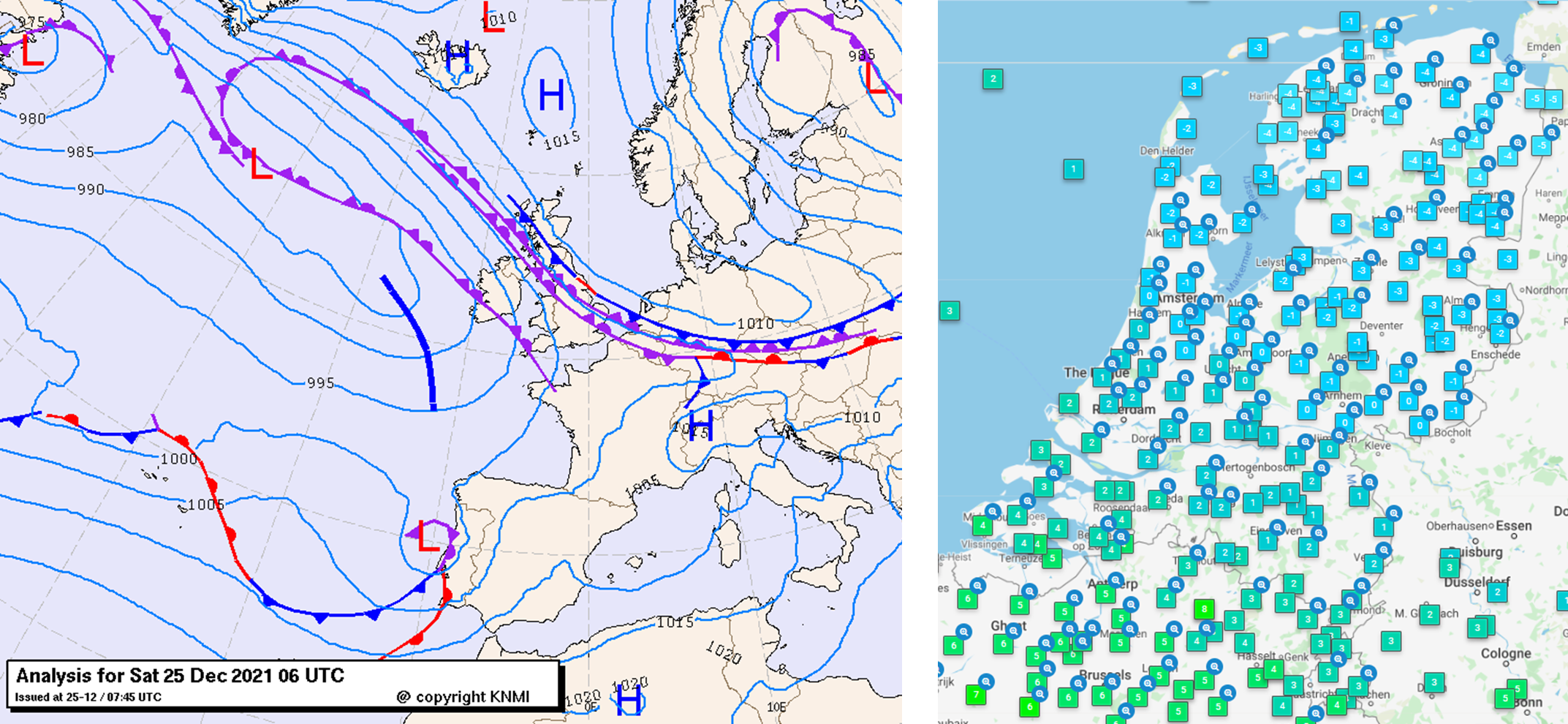Figuur 3: Links: De weerkaart op eerste kerstdag in de ochtend. Alle fronten liggen dicht bij elkaar boven het zuiden. Rechts: De waarnemingen op eerste kerstdag om 07:00 LT (06:00 UTC). Ten noorden de rivieren is het al erg koud.