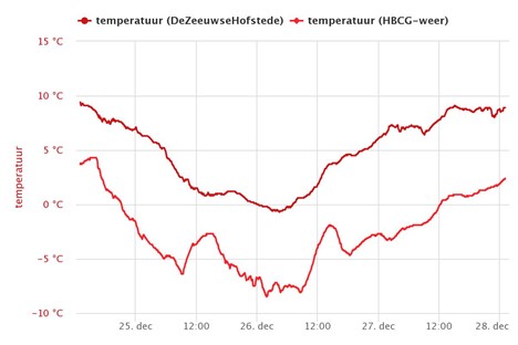 In Zeeland is de temperatuur in de nacht van eerste op tweede kerstdag maar kort onder nul uitgekomen. Verder is het in Zeeland de hele kerst bewolkt geweest. Dit is ook te zien in de temperatuurwaarneming. Bij HBCG-weer (in noordoost-Groningen) zie je een duidelijke temperatuurstijging overdag en -daling in de nacht op beide kerstdagen, dit komt door de instraling van de zon. Bij DeZeeuwseHofstede is de temperatuur ongeveer gelijk gebleven en je geen duidelijke dagelijkse dag door de zon. Dat komt omdat het bewolkt is geweest de hele periode.