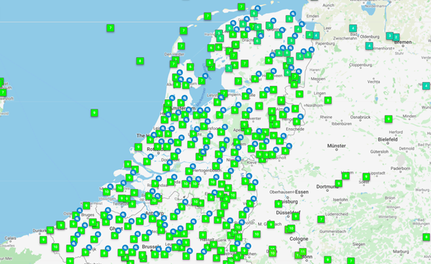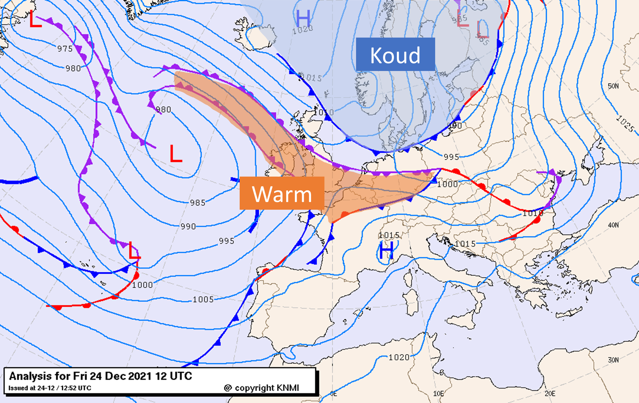 Als we kijken naar de weerkaart op de dag voor kerst zien we heel veel fronten in de buurt (Figuur 1). Het koufront (de blauwe lijn) ten noorden van Nederland en de occlusie (de paarse lijn) boven Nederland zijn van belang. Als een front koude lucht brengt is het een koufront. Ten noorden van dit koufront zit (hele) koude lucht. Ten zuiden van de occlusie zit warme lucht. Daar tussenin zit wat koelere lucht. In de waarnemingen op dit tijdstip zien we ook deze verdeling heel duidelijk (Figuur 2). De warmste lucht in het zuiden, in het noorden zit al in de iets koelere lucht, maar de echte kou zit nog ten noorden van ons.